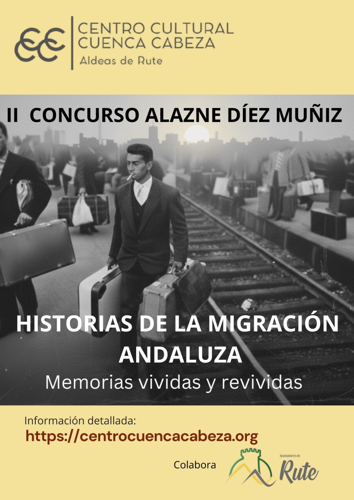 El Centro Cultural Cuenca Cabeza, en colaboración con el Ayuntamiento de Rute, organiza el IIº concurso sobre Historias de la migración andaluza de los años 50, 60 y 70 del siglo XX. Su objetivo es salvaguardar la memoria de un pasado histórico reciente y promover el desarrollo de la identidad de las aldeas andaluzas.