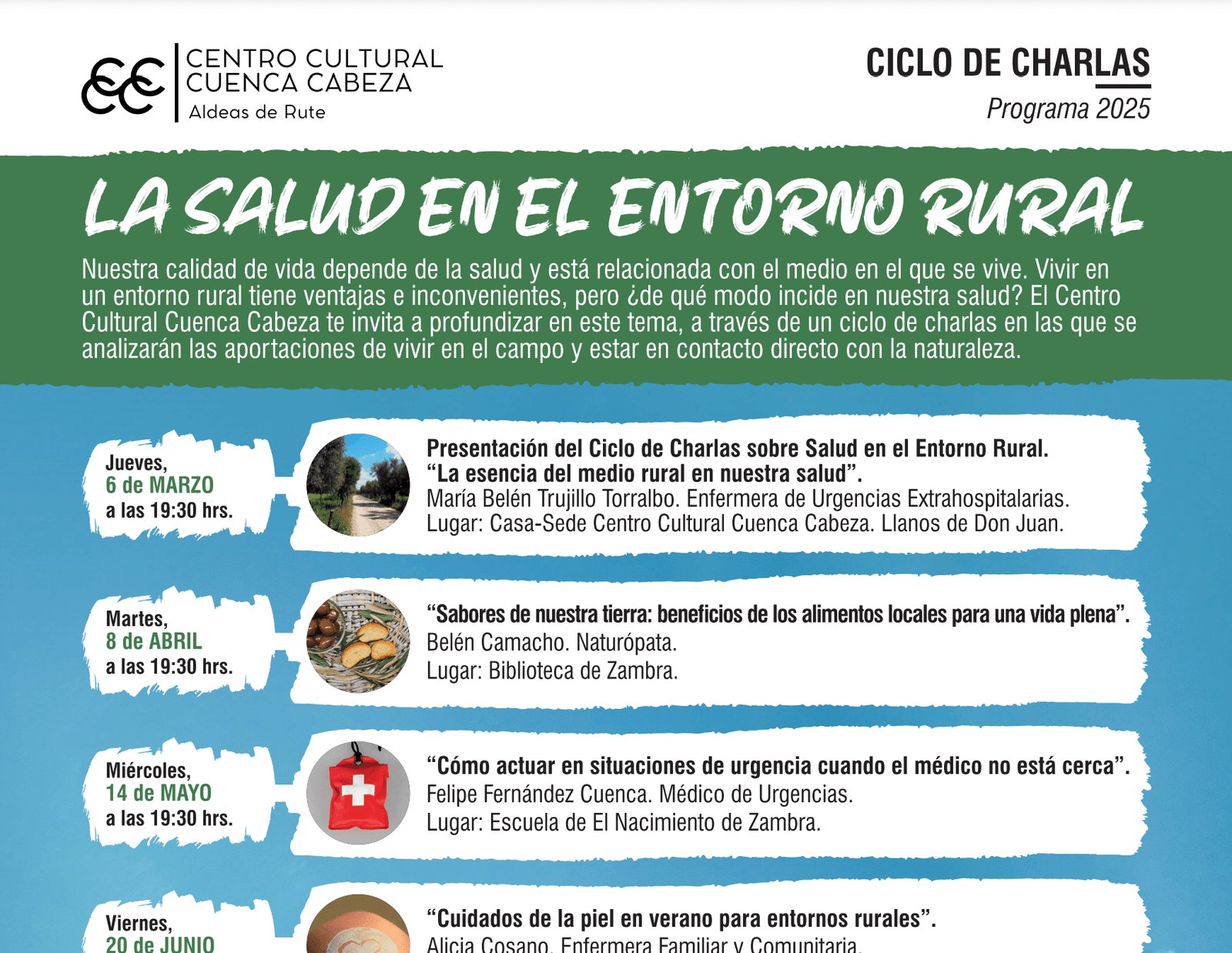 Nuestra calidad de vida depende de la salud y está relacionada con el medio en el que se vive. Vivir en un entorno rural tiene ventajas e inconvenientes, pero ¿de qué modo incide en nuestra salud?. el Centro Cultural Cuenca Cabeza te invita a profundizar en este tema, a través de un ciclo de charlas.